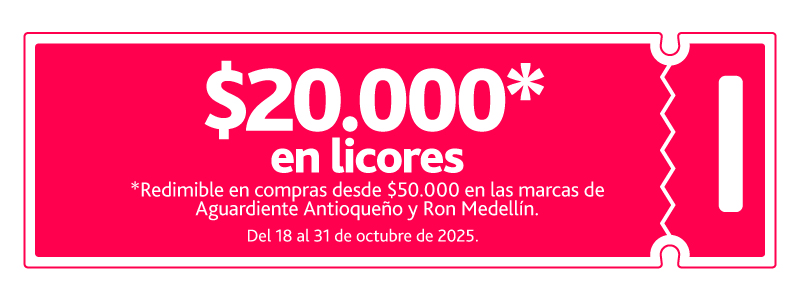 Oferta personal e intransferible. *Aplica para compras iguales y superiores a $50.000 para todas las referencias de Aguardiente Antioqueño y Ron Medellín. Para el usar el bono debes dar el número de Puntos Olímpica y pagar con tu Tarjeta Olímpica. Aplica solo para compra en tiendas físicas Olímpica. Máximo un bono por cliente. Oferta válida del 18 al 31 de octubre de 2025. No acumulable con otras promociones y/o descuentos. Banco Serfinanza solo actúa como ente emisor del medio de pago, los productos y/o servicios son responsabilidad dle aliado. Consulta términos y condiciones en tarjetaolimpica.com.co.
